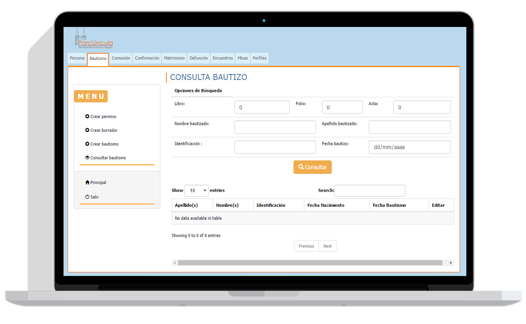 El sistema es capaz de almacenar información de los siguientes sacramentos: