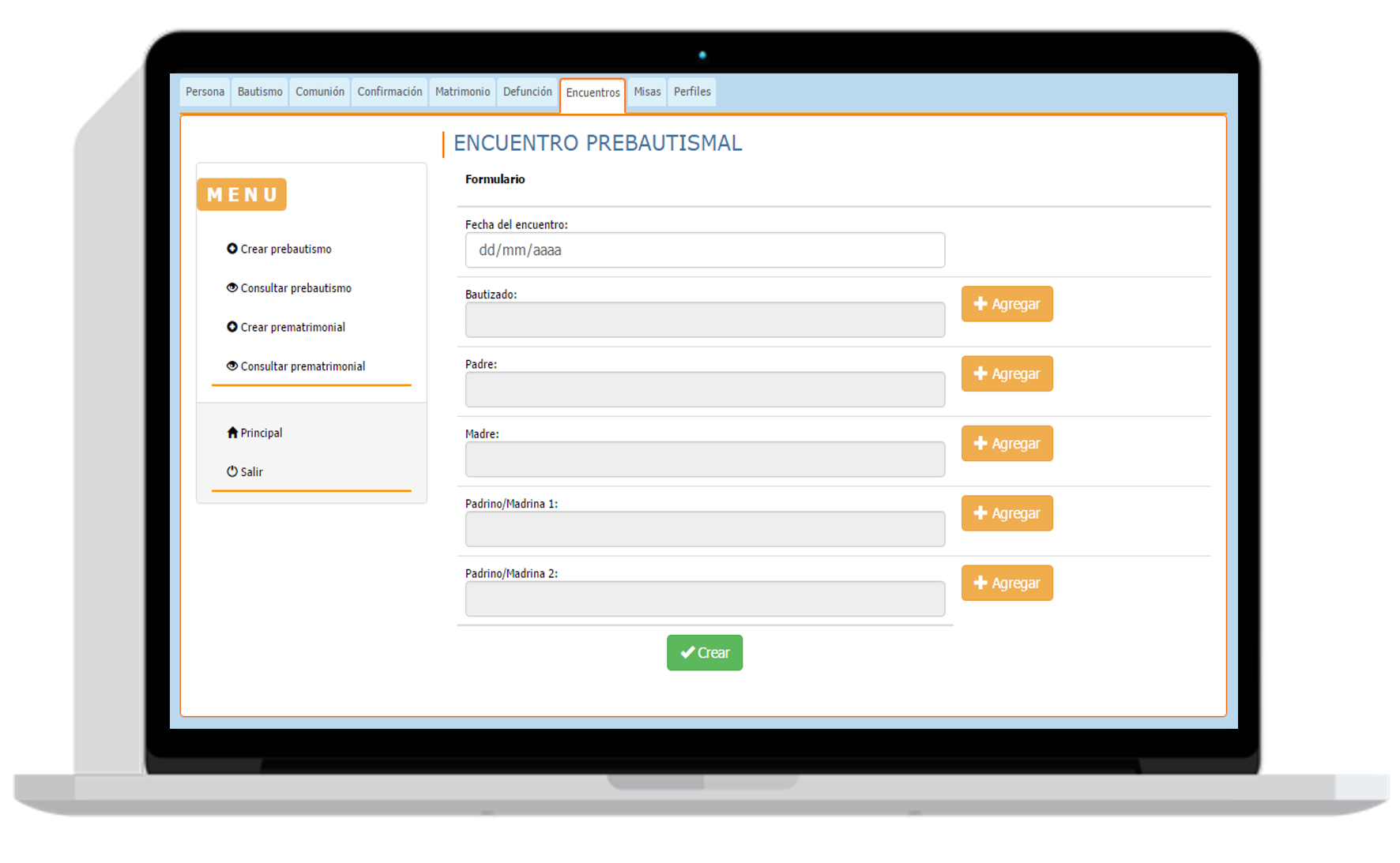 Sistema Siete permite la creación y actualización de sacramentos con la persona principal de la partida y sus respectivos familiares, como lo pueden ser padres, padrinos, abuelos, testigos, entre otros.
