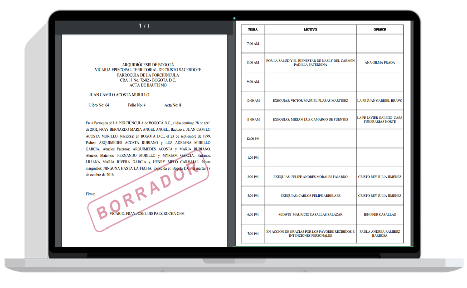 El servicio de misas le permite al usuario llevar en una agenda, los eventos a realizar de la iglesia, como lo pueden ser acciónes de gracias, misas por un difunto, entre otros.
